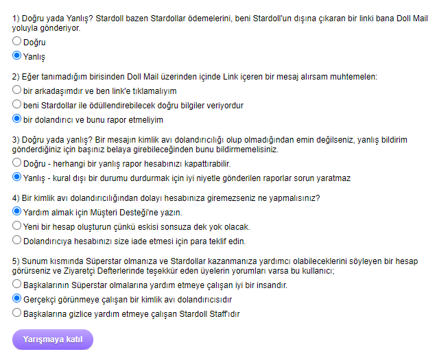 Bugün yayınlanan Tuzağa Düşme! - Stardoll'da Kimlik Avı Dolandırıcılığını (Phishing) Önlemek için İpuçları yazısı sonrası konuyla alakalı bir quiz geldi. Quizin duyurusu aşağıda: